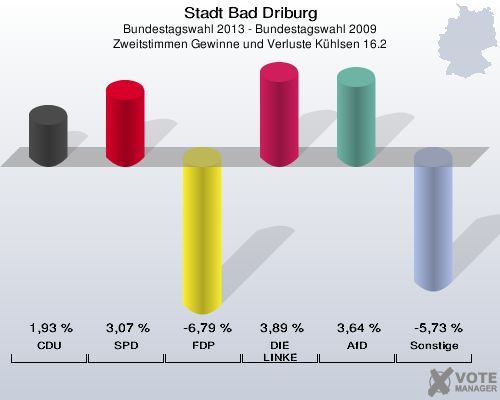 Stadt Bad Driburg, Bundestagswahl 2013 - Bundestagswahl 2009, Zweitstimmen Gewinne und Verluste Kühlsen 16.2: CDU: 1,93 %. SPD: 3,07 %. FDP: -6,79 %. DIE LINKE: 3,89 %. AfD: 3,64 %. Sonstige: -5,73 %. http://www.votemanager.de