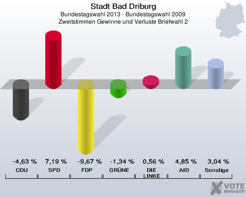 Stadt Bad Driburg, Bundestagswahl 2013 - Bundestagswahl 2009, Zweitstimmen Gewinne und Verluste Briefwahl 2: CDU: -4,63 %. SPD: 7,19 %. FDP: -9,67 %. GRÜNE: -1,34 %. DIE LINKE: 0,56 %. AfD: 4,85 %. Sonstige: 3,04 %. http://www.votemanager.de