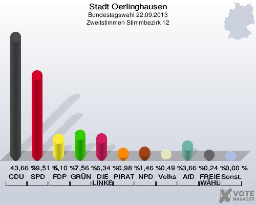 Stadt Oerlinghausen, Bundestagswahl 22.09.2013, Zweitstimmen Stimmbezirk 12: CDU: 43,66 %. SPD: 29,51 %. FDP: 6,10 %. GRÜNE: 7,56 %. DIE LINKE: 6,34 %. PIRATEN: 0,98 %. NPD: 1,46 %. Volksabstimmung: 0,49 %. AfD: 3,66 %. FREIE WÄHLER: 0,24 %. Sonstige: 0,00 %. http://www.votemanager.de