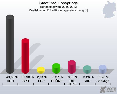 Stadt Bad Lippspringe, Bundestagswahl 22.09.2013, Zweitstimmen DRK-Kindertageseinrichtung (II): CDU: 49,69 %. SPD: 27,98 %. FDP: 2,01 %. GRÜNE: 5,27 %. DIE LINKE: 8,03 %. AfD: 3,26 %. Sonstige: 3,78 %. http://www.votemanager.de