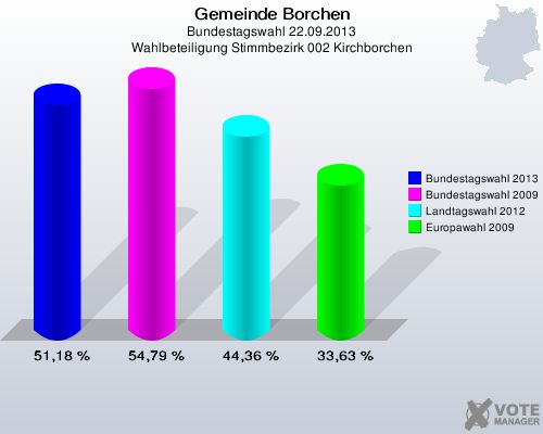 Gemeinde Borchen, Bundestagswahl 22.09.2013, Wahlbeteiligung Stimmbezirk 002 Kirchborchen: Bundestagswahl 2013: 51,18 %. Bundestagswahl 2009: 54,79 %. Landtagswahl 2012: 44,36 %. Europawahl 2009: 33,63 %. http://www.votemanager.de