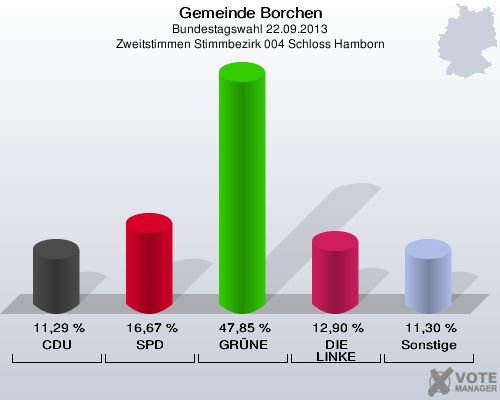 Gemeinde Borchen, Bundestagswahl 22.09.2013, Zweitstimmen Stimmbezirk 004 Schloss Hamborn: CDU: 11,29 %. SPD: 16,67 %. GRÜNE: 47,85 %. DIE LINKE: 12,90 %. Sonstige: 11,30 %. http://www.votemanager.de