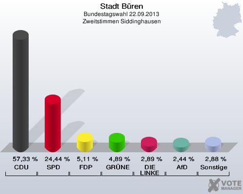Stadt Büren, Bundestagswahl 22.09.2013, Zweitstimmen Siddinghausen: CDU: 57,33 %. SPD: 24,44 %. FDP: 5,11 %. GRÜNE: 4,89 %. DIE LINKE: 2,89 %. AfD: 2,44 %. Sonstige: 2,88 %. http://www.votemanager.de
