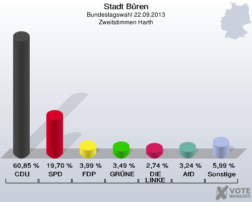 Stadt Büren, Bundestagswahl 22.09.2013, Zweitstimmen Harth: CDU: 60,85 %. SPD: 19,70 %. FDP: 3,99 %. GRÜNE: 3,49 %. DIE LINKE: 2,74 %. AfD: 3,24 %. Sonstige: 5,99 %. http://www.votemanager.de