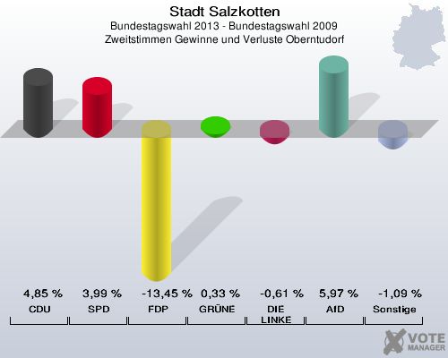 Stadt Salzkotten, Bundestagswahl 2013 - Bundestagswahl 2009, Zweitstimmen Gewinne und Verluste Oberntudorf: CDU: 4,85 %. SPD: 3,99 %. FDP: -13,45 %. GRÜNE: 0,33 %. DIE LINKE: -0,61 %. AfD: 5,97 %. Sonstige: -1,09 %. http://www.votemanager.de