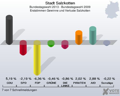 Stadt Salzkotten, Bundestagswahl 2013 - Bundestagswahl 2009, Erststimmen Gewinne und Verluste Salzkotten: CDU: 5,19 %. SPD: -2,19 %. FDP: -6,36 %. GRÜNE: -0,46 %. DIE LINKE: -0,86 %. PIRATEN: 2,02 %. AfD: 2,88 %. Sonstige: -0,22 %. 7 von 7 Schnellmeldungen http://www.votemanager.de