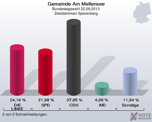 Gemeinde Am Mellensee, Bundestagswahl 22.09.2013, Zweitstimmen Sperenberg: DIE LINKE: 24,16 %. SPD: 21,98 %. CDU: 37,85 %. AfD: 4,08 %. Sonstige: 11,94 %. 2 von 2 Schnellmeldungen http://www.votemanager.de