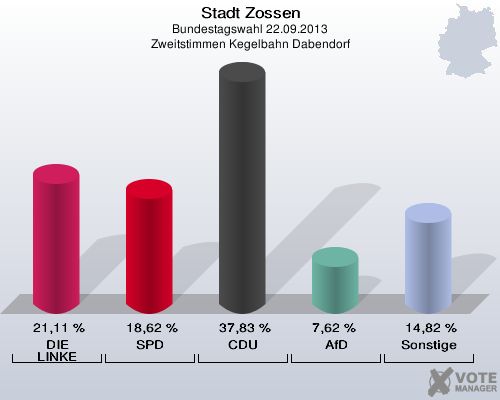 Stadt Zossen, Bundestagswahl 22.09.2013, Zweitstimmen Kegelbahn Dabendorf: DIE LINKE: 21,11 %. SPD: 18,62 %. CDU: 37,83 %. AfD: 7,62 %. Sonstige: 14,82 %. http://www.votemanager.de