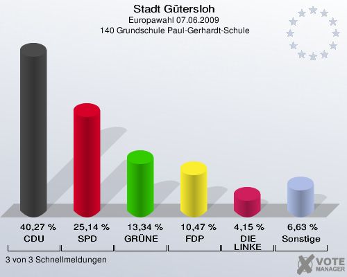 Stadt Gütersloh, Europawahl 07.06.2009,  140 Grundschule Paul-Gerhardt-Schule: CDU: 40,27 %. SPD: 25,14 %. GRÜNE: 13,34 %. FDP: 10,47 %. DIE LINKE: 4,15 %. Sonstige: 6,63 %. 3 von 3 Schnellmeldungen http://www.votemanager.de