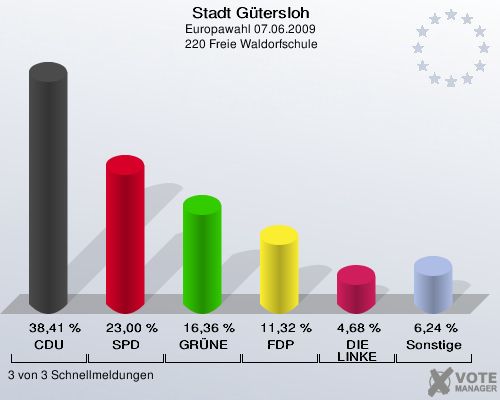 Stadt Gütersloh, Europawahl 07.06.2009,  220 Freie Waldorfschule: CDU: 38,41 %. SPD: 23,00 %. GRÜNE: 16,36 %. FDP: 11,32 %. DIE LINKE: 4,68 %. Sonstige: 6,24 %. 3 von 3 Schnellmeldungen http://www.votemanager.de