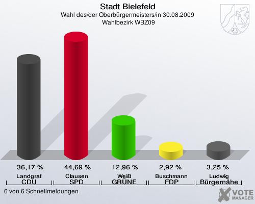 Stadt Bielefeld, Wahl des/der Oberbürgermeisters/in 30.08.2009,  Wahlbezirk WBZ09: Landgraf CDU: 36,17 %. Clausen SPD: 44,69 %. Weiß GRÜNE: 12,96 %. Buschmann FDP: 2,92 %. Ludwig Bürgernähe: 3,25 %. 6 von 6 Schnellmeldungen http://www.votemanager.de