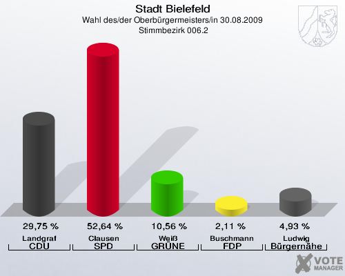 Stadt Bielefeld, Wahl des/der Oberbürgermeisters/in 30.08.2009,  Stimmbezirk 006.2: Landgraf CDU: 29,75 %. Clausen SPD: 52,64 %. Weiß GRÜNE: 10,56 %. Buschmann FDP: 2,11 %. Ludwig Bürgernähe: 4,93 %. http://www.votemanager.de