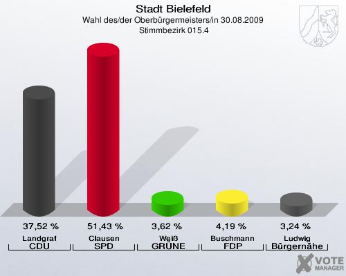 Stadt Bielefeld, Wahl des/der Oberbürgermeisters/in 30.08.2009,  Stimmbezirk 015.4: Landgraf CDU: 37,52 %. Clausen SPD: 51,43 %. Weiß GRÜNE: 3,62 %. Buschmann FDP: 4,19 %. Ludwig Bürgernähe: 3,24 %. http://www.votemanager.de