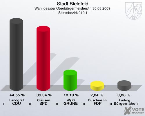 Stadt Bielefeld, Wahl des/der Oberbürgermeisters/in 30.08.2009,  Stimmbezirk 019.1: Landgraf CDU: 44,55 %. Clausen SPD: 39,34 %. Weiß GRÜNE: 10,19 %. Buschmann FDP: 2,84 %. Ludwig Bürgernähe: 3,08 %. http://www.votemanager.de