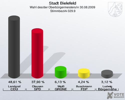 Stadt Bielefeld, Wahl des/der Oberbürgermeisters/in 30.08.2009,  Stimmbezirk 029.9: Landgraf CDU: 48,61 %. Clausen SPD: 37,90 %. Weiß GRÜNE: 6,13 %. Buschmann FDP: 4,24 %. Ludwig Bürgernähe: 3,12 %. http://www.votemanager.de