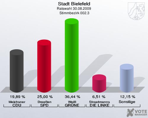 Stadt Bielefeld, Ratswahl 30.08.2009,  Stimmbezirk 002.3: Meichsner CDU: 19,89 %. Dreeßen SPD: 25,00 %. Weiß GRÜNE: 36,44 %. Straetmanns DIE LINKE: 6,51 %. Sonstige: 12,15 %. http://www.votemanager.de