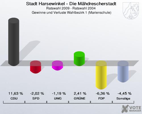 Stadt Harsewinkel - Die Mähdrescherstadt, Ratswahl 2009 - Ratswahl 2004,  Gewinne und Verluste Wahlbezirk 1 (Marienschule): CDU: 11,63 %. SPD: -2,02 %. UWG: -1,19 %. GRÜNE: 2,41 %. FDP: -6,36 %. Sonstige: -4,45 %. http://www.votemanager.de