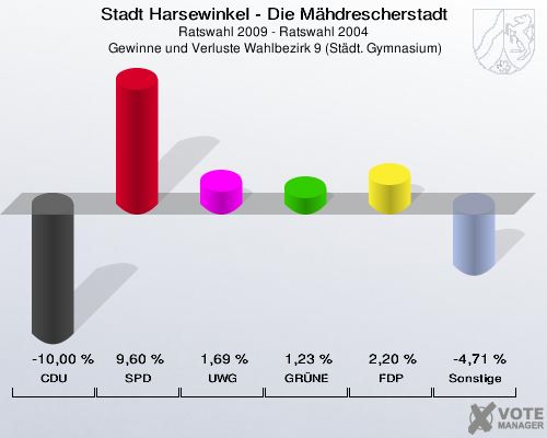Stadt Harsewinkel - Die Mähdrescherstadt, Ratswahl 2009 - Ratswahl 2004,  Gewinne und Verluste Wahlbezirk 9 (Städt. Gymnasium): CDU: -10,00 %. SPD: 9,60 %. UWG: 1,69 %. GRÜNE: 1,23 %. FDP: 2,20 %. Sonstige: -4,71 %. http://www.votemanager.de