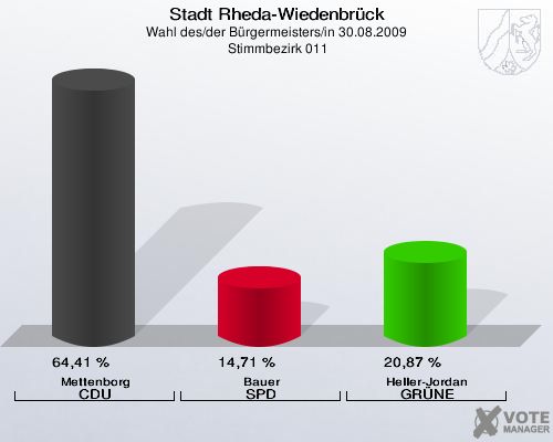 Stadt Rheda-Wiedenbrück, Wahl des/der Bürgermeisters/in 30.08.2009,  Stimmbezirk 011: Mettenborg CDU: 64,41 %. Bauer SPD: 14,71 %. Heller-Jordan GRÜNE: 20,87 %. http://www.votemanager.de