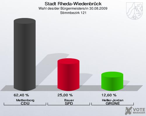 Stadt Rheda-Wiedenbrück, Wahl des/der Bürgermeisters/in 30.08.2009,  Stimmbezirk 121: Mettenborg CDU: 62,40 %. Bauer SPD: 25,00 %. Heller-Jordan GRÜNE: 12,60 %. http://www.votemanager.de