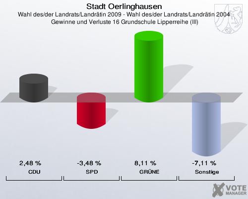 Stadt Oerlinghausen, Wahl des/der Landrats/Landrätin 2009 - Wahl des/der Landrats/Landrätin 2004,  Gewinne und Verluste 16 Grundschule Lipperreihe (III): CDU: 2,48 %. SPD: -3,48 %. GRÜNE: 8,11 %. Sonstige: -7,11 %. http://www.votemanager.de