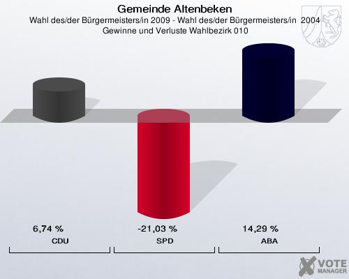 Gemeinde Altenbeken, Wahl des/der Bürgermeisters/in 2009 - Wahl des/der Bürgermeisters/in  2004,  Gewinne und Verluste Wahlbezirk 010: CDU: 6,74 %. SPD: -21,03 %. ABA: 14,29 %. http://www.votemanager.de