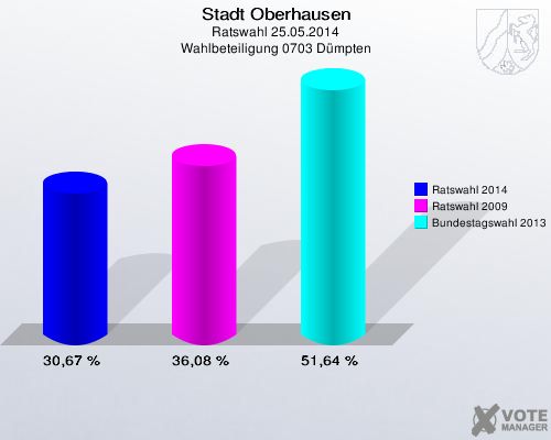 Stadt Oberhausen, Ratswahl 25.05.2014, Wahlbeteiligung 0703 Dümpten: Ratswahl 2014: 30,67 %. Ratswahl 2009: 36,08 %. Bundestagswahl 2013: 51,64 %. http://www.votemanager.de