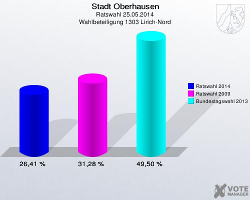 Stadt Oberhausen, Ratswahl 25.05.2014, Wahlbeteiligung 1303 Lirich-Nord: Ratswahl 2014: 26,41 %. Ratswahl 2009: 31,28 %. Bundestagswahl 2013: 49,50 %. http://www.votemanager.de