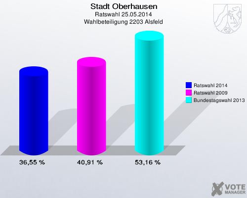 Stadt Oberhausen, Ratswahl 25.05.2014, Wahlbeteiligung 2203 Alsfeld: Ratswahl 2014: 36,55 %. Ratswahl 2009: 40,91 %. Bundestagswahl 2013: 53,16 %. http://www.votemanager.de