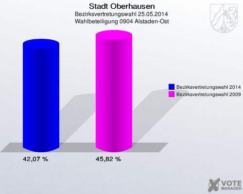 Stadt Oberhausen, Bezirksvertretungswahl 25.05.2014, Wahlbeteiligung 0904 Alstaden-Ost: Bezirksvertretungswahl 2014: 42,07 %. Bezirksvertretungswahl 2009: 45,82 %. http://www.votemanager.de