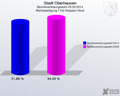 Stadt Oberhausen, Bezirksvertretungswahl 25.05.2014, Wahlbeteiligung 1102 Alstaden-Nord: Bezirksvertretungswahl 2014: 31,80 %. Bezirksvertretungswahl 2009: 34,40 %. http://www.votemanager.de