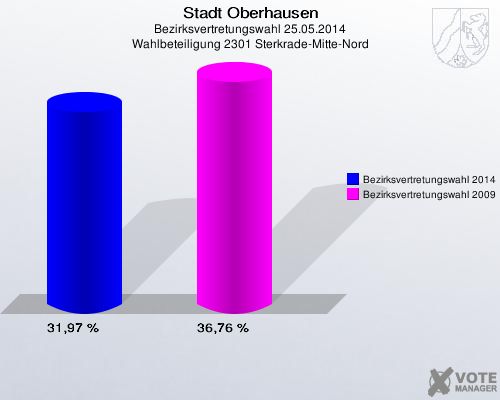 Stadt Oberhausen, Bezirksvertretungswahl 25.05.2014, Wahlbeteiligung 2301 Sterkrade-Mitte-Nord: Bezirksvertretungswahl 2014: 31,97 %. Bezirksvertretungswahl 2009: 36,76 %. http://www.votemanager.de