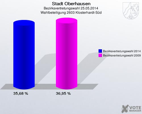 Stadt Oberhausen, Bezirksvertretungswahl 25.05.2014, Wahlbeteiligung 2603 Klosterhardt-Süd: Bezirksvertretungswahl 2014: 35,68 %. Bezirksvertretungswahl 2009: 36,95 %. http://www.votemanager.de