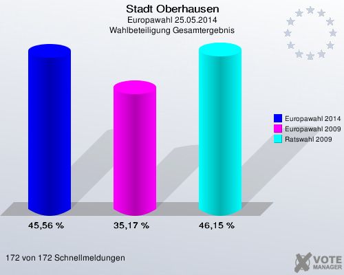 Stadt Oberhausen, Europawahl 25.05.2014, Wahlbeteiligung Gesamtergebnis: Europawahl 2014: 45,56 %. Europawahl 2009: 35,17 %. Ratswahl 2009: 46,15 %. 172 von 172 Schnellmeldungen http://www.votemanager.de