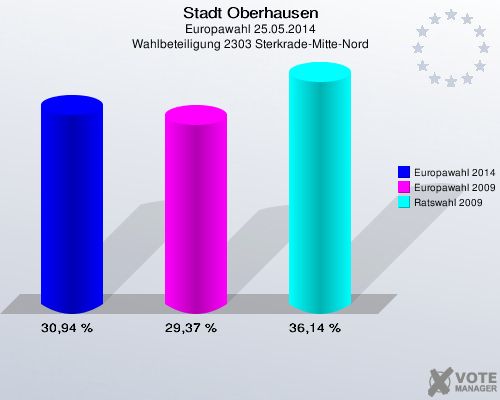 Stadt Oberhausen, Europawahl 25.05.2014, Wahlbeteiligung 2303 Sterkrade-Mitte-Nord: Europawahl 2014: 30,94 %. Europawahl 2009: 29,37 %. Ratswahl 2009: 36,14 %. http://www.votemanager.de