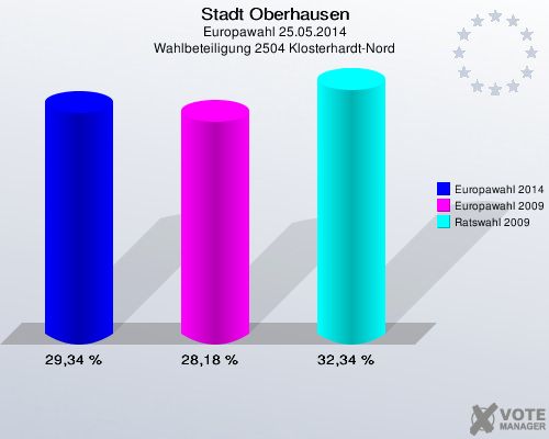 Stadt Oberhausen, Europawahl 25.05.2014, Wahlbeteiligung 2504 Klosterhardt-Nord: Europawahl 2014: 29,34 %. Europawahl 2009: 28,18 %. Ratswahl 2009: 32,34 %. http://www.votemanager.de