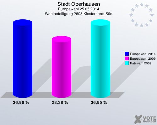 Stadt Oberhausen, Europawahl 25.05.2014, Wahlbeteiligung 2603 Klosterhardt-Süd: Europawahl 2014: 36,96 %. Europawahl 2009: 28,38 %. Ratswahl 2009: 36,95 %. http://www.votemanager.de