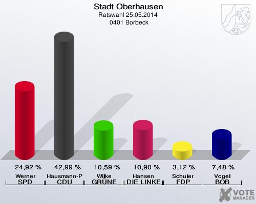 Stadt Oberhausen, Ratswahl 25.05.2014,  0401 Borbeck: Werner SPD: 24,92 %. Hausmann-Peters CDU: 42,99 %. Wilke GRÜNE: 10,59 %. Hansen DIE LINKE: 10,90 %. Schuler FDP: 3,12 %. Vogel BOB: 7,48 %. http://www.votemanager.de