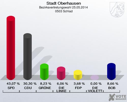Stadt Oberhausen, Bezirksvertretungswahl 25.05.2014,  0503 Schlad: SPD: 43,07 %. CDU: 30,30 %. GRÜNE: 8,23 %. DIE LINKE: 6,06 %. FDP: 3,68 %. DIE VIOLETTEN: 0,00 %. BOB: 8,66 %. http://www.votemanager.de