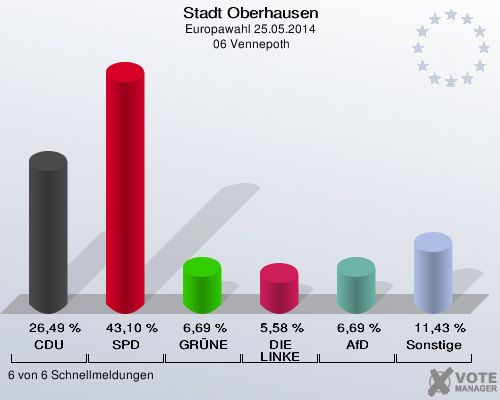 Stadt Oberhausen, Europawahl 25.05.2014,  06 Vennepoth: CDU: 26,49 %. SPD: 43,10 %. GRÜNE: 6,69 %. DIE LINKE: 5,58 %. AfD: 6,69 %. Sonstige: 11,43 %. 6 von 6 Schnellmeldungen http://www.votemanager.de