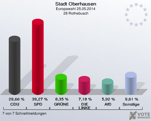Stadt Oberhausen, Europawahl 25.05.2014,  28 Rothebusch: CDU: 29,66 %. SPD: 39,27 %. GRÜNE: 8,35 %. DIE LINKE: 7,18 %. AfD: 5,92 %. Sonstige: 9,61 %. 7 von 7 Schnellmeldungen http://www.votemanager.de