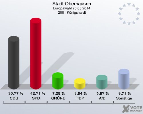 Stadt Oberhausen, Europawahl 25.05.2014,  2001 Königshardt: CDU: 30,77 %. SPD: 42,71 %. GRÜNE: 7,29 %. FDP: 3,64 %. AfD: 5,87 %. Sonstige: 9,71 %. http://www.votemanager.de