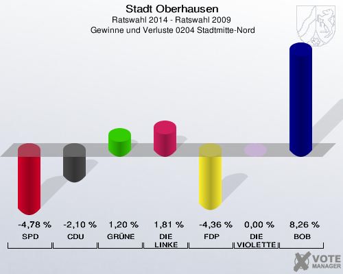 Stadt Oberhausen, Ratswahl 2014 - Ratswahl 2009,  Gewinne und Verluste 0204 Stadtmitte-Nord: SPD: -4,78 %. CDU: -2,10 %. GRÜNE: 1,20 %. DIE LINKE: 1,81 %. FDP: -4,36 %. DIE VIOLETTEN: 0,00 %. BOB: 8,26 %. http://www.votemanager.de