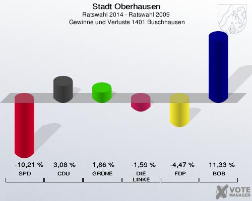 Stadt Oberhausen, Ratswahl 2014 - Ratswahl 2009,  Gewinne und Verluste 1401 Buschhausen: SPD: -10,21 %. CDU: 3,08 %. GRÜNE: 1,86 %. DIE LINKE: -1,59 %. FDP: -4,47 %. BOB: 11,33 %. http://www.votemanager.de