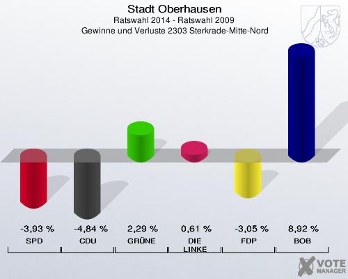 Stadt Oberhausen, Ratswahl 2014 - Ratswahl 2009,  Gewinne und Verluste 2303 Sterkrade-Mitte-Nord: SPD: -3,93 %. CDU: -4,84 %. GRÜNE: 2,29 %. DIE LINKE: 0,61 %. FDP: -3,05 %. BOB: 8,92 %. http://www.votemanager.de