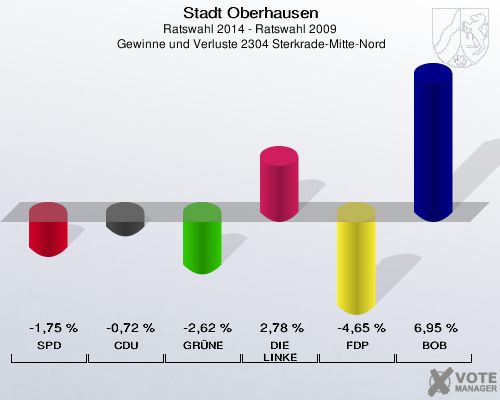Stadt Oberhausen, Ratswahl 2014 - Ratswahl 2009,  Gewinne und Verluste 2304 Sterkrade-Mitte-Nord: SPD: -1,75 %. CDU: -0,72 %. GRÜNE: -2,62 %. DIE LINKE: 2,78 %. FDP: -4,65 %. BOB: 6,95 %. http://www.votemanager.de