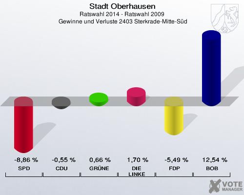 Stadt Oberhausen, Ratswahl 2014 - Ratswahl 2009,  Gewinne und Verluste 2403 Sterkrade-Mitte-Süd: SPD: -8,86 %. CDU: -0,55 %. GRÜNE: 0,66 %. DIE LINKE: 1,70 %. FDP: -5,49 %. BOB: 12,54 %. http://www.votemanager.de