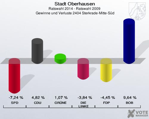 Stadt Oberhausen, Ratswahl 2014 - Ratswahl 2009,  Gewinne und Verluste 2404 Sterkrade-Mitte-Süd: SPD: -7,24 %. CDU: 4,82 %. GRÜNE: 1,07 %. DIE LINKE: -3,84 %. FDP: -4,45 %. BOB: 9,64 %. http://www.votemanager.de