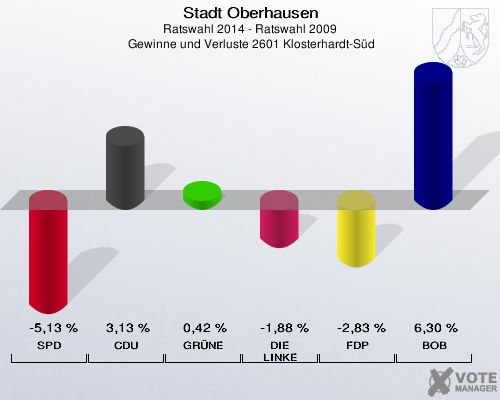 Stadt Oberhausen, Ratswahl 2014 - Ratswahl 2009,  Gewinne und Verluste 2601 Klosterhardt-Süd: SPD: -5,13 %. CDU: 3,13 %. GRÜNE: 0,42 %. DIE LINKE: -1,88 %. FDP: -2,83 %. BOB: 6,30 %. http://www.votemanager.de