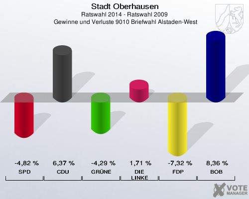 Stadt Oberhausen, Ratswahl 2014 - Ratswahl 2009,  Gewinne und Verluste 9010 Briefwahl Alstaden-West: SPD: -4,82 %. CDU: 6,37 %. GRÜNE: -4,29 %. DIE LINKE: 1,71 %. FDP: -7,32 %. BOB: 8,36 %. http://www.votemanager.de